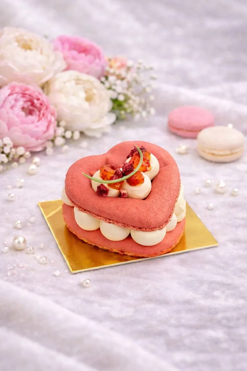 Finished with fresh strawberries, the profile becomes bright and naturally sweet, adding freshness and a juicy contrast to the creamy filling.