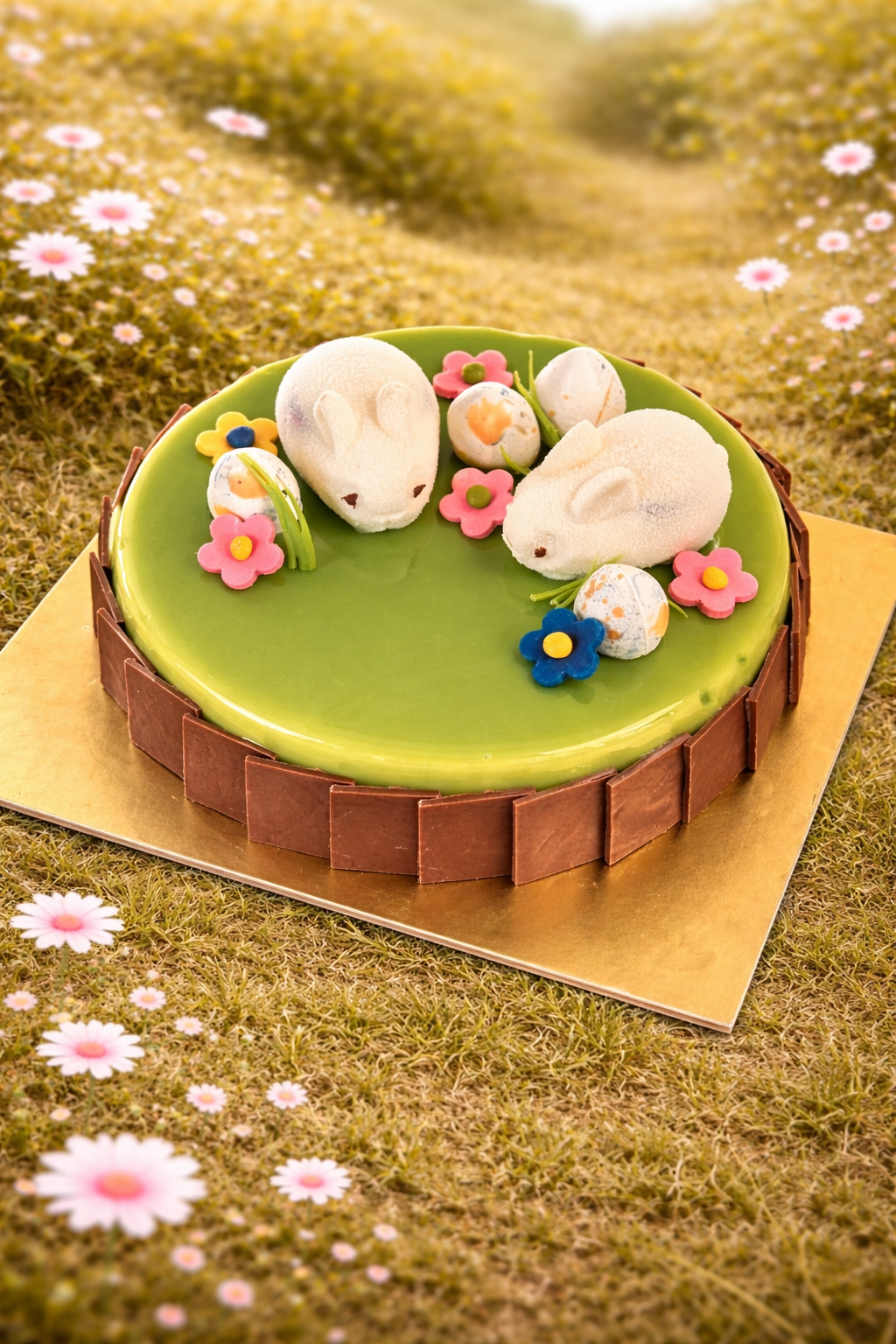 Inside every cake: — Hazelnut white chocolate mousse — silky, deep, indulgent — Toasted hazelnut dacquoise — light crunch, warm nuttiness — Passion fruit & mango gelée insert — vibrant, sharp, unexpected — Finished with an elegant glaze and signature Easter decoration